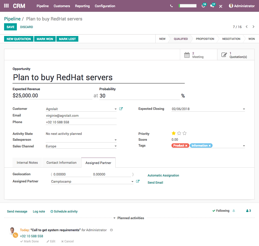Schedule activities based on your sales scripts: calls, meetings, mailing, and quotations. Get all the information you need, directly on the opportunity: website pages viewed, mail received, etc.